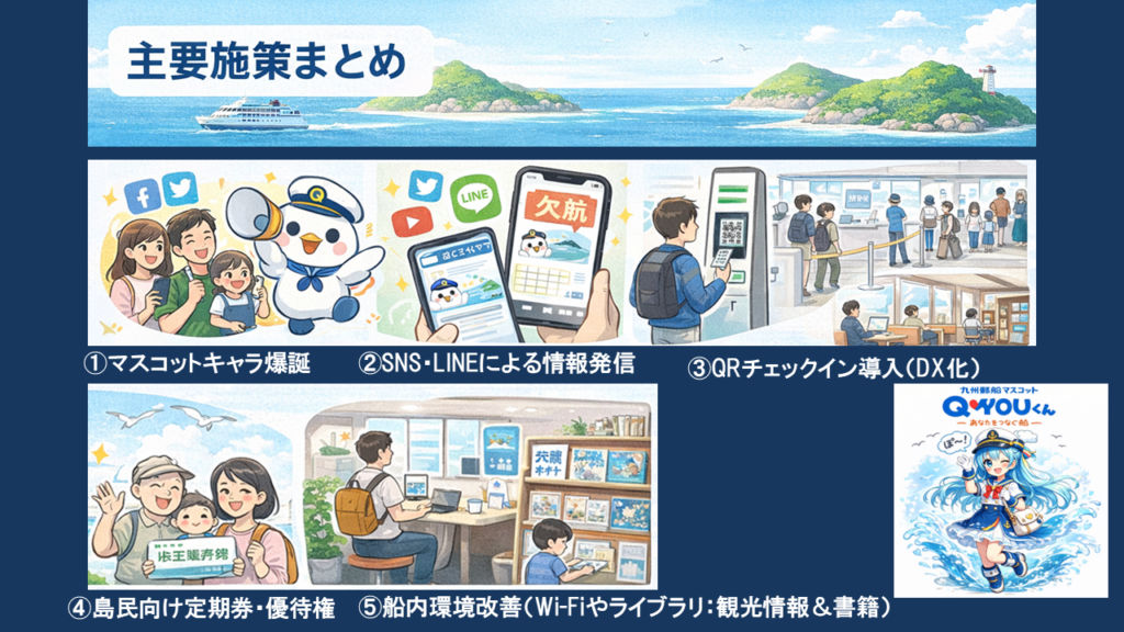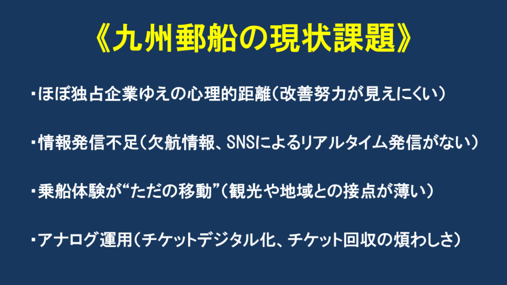 そのために、SNSでの情報発信やQRチェックイン等のDX化、船内環境の向上等も含めて、船の魅力を伝えながら、充実させる施策を九州郵船には期待したい所です。
