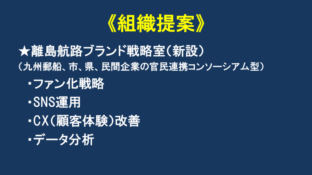 例えば、九州郵船壱岐支店に、「離島航路ブランド戦略室」のような官民連携の場があると面白いのではないかと思っています。