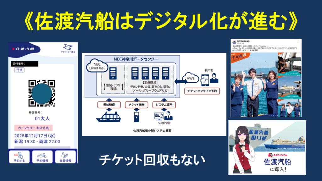 ちなみに昨年12月に佐渡島に行ったのですが、佐渡汽船はデジタル化が進んでおり、フェリーターミナルも観光化情報が多く、お金を落とすポイントもたくさんありました。参考になる事例だと思います。
