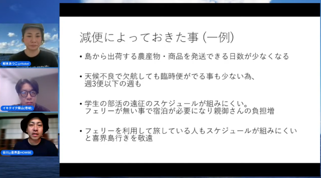 便数が減ったこと自体ももちろん課題ですが、それ以上に気になるのは“中身”の部分です。そもそも以前から現状課題として、以下に記すような課題を島民は感じており、今回の減便がキッカケでこうした不満もあらためて表出しているように思います。