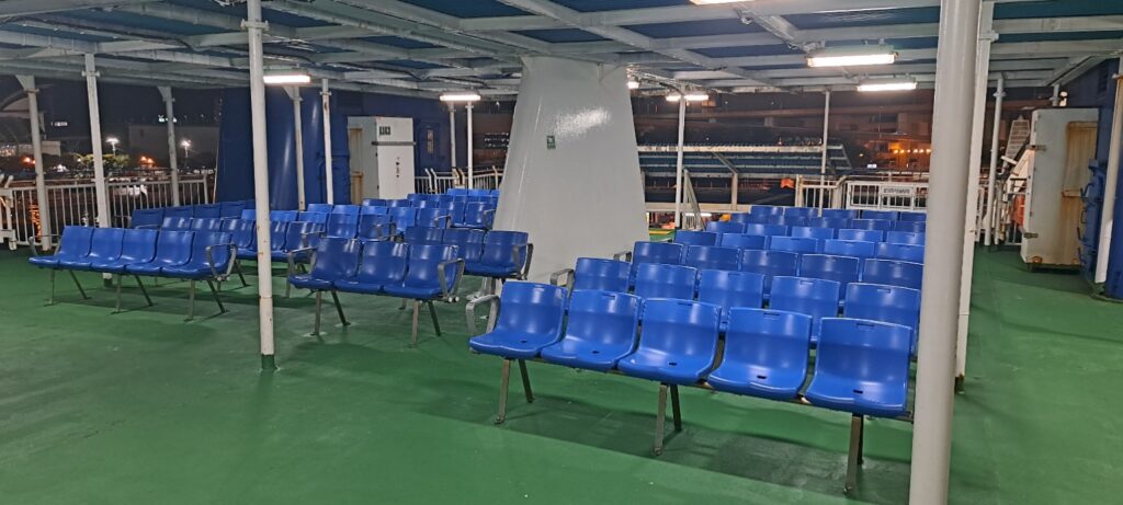 デッキにある座席スペースは風もあたるので、ここに座る人は多くはいません。タバコを吸う方がいるイメージ。
