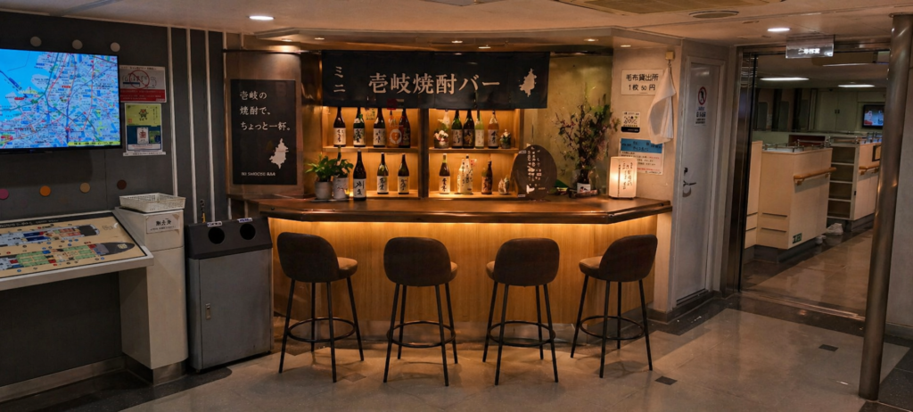 毛布貸し出し後は特に稼働しないこの毛布貸し出しコーナー。なんとなくカウンターバーっぽかったので、壱岐焼酎カウンターにしてみましょう。